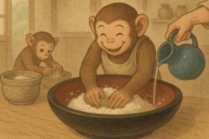 広げられたこね鉢の前で、猿のサル之助が手を洗い、器用に水を注ぐ。粉の真ん中にくぼみを作り、少しずつ水を入れ、犬猿仲良くお互い協力、美味しい信州蕎麦が出来上がり。